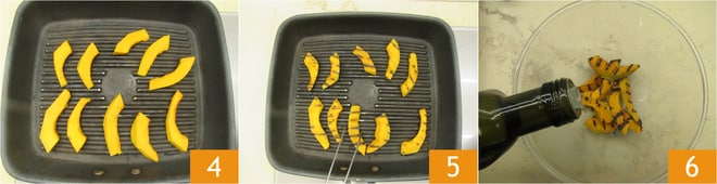Grillen Sie die Kürbisscheiben von beiden Seiten auf einem heißen Grill 4, bis sie gut gekocht sind 5. Übertragen Sie den Kürbis in eine Schüssel und würzen Sie ihn mit Öl 6,