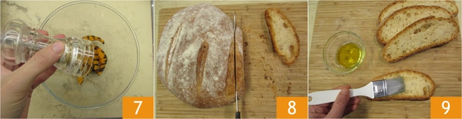 Pfeffer und Salz 7, stellen Sie ihn beiseite. Schneiden Sie das Brot in Scheiben 8 und bestreichen Sie es mit Olivenöl 9.
