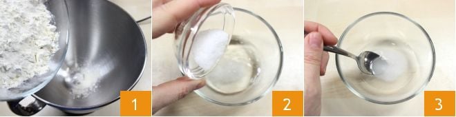 Um das Brot und Salami vorzubereiten, beginnen Sie mit dem Brotteig: Geben Sie das gesiebte Manitoba-Mehl und Mehl Typ 0 in die Schüssel einer Küchenmaschine oder in eine große Schüssel, wenn Sie von Hand kneten 1. Gießen Sie einen kleinen Teil des gesamten Wassers in eine kleine Schüssel, fügen Sie das Salz hinzu 2 und lösen Sie es durch Rühren mit einem Teelöffel auf 3. Wenn Sie kein Manitoba-Mehl finden, können Sie nur Mehl Typ 0 verwenden. Achten Sie darauf, ein Mehl Typ 0 zu wählen, das mindestens 11% Protein enthält. Diese Information können Sie auf der Verpackung des Produkts nachlesen. Mehl Typ 0 und Manitoba-Mehl haben beide einen hohen Glutengehalt, unterscheiden sich jedoch im Grad der Raffinierung.