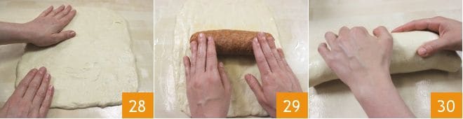 In der Zwischenzeit nehmen Sie den Brotteig, der aufgegangen ist, und übertragen ihn auf eine leicht geölte Fläche, damit er nicht klebt. Ölen Sie auch Ihre Hände, wenn nötig, und rollen Sie ihn aus, sodass er eine rechteckige Form und eine Dicke von etwa 2 cm erhält 28. Legen Sie die Füllung in die Mitte des entstandenen Rechtecks 29 und rollen Sie den Teig darüber 30, indem Sie die Enden auf der Seite der Schließung umklappen.