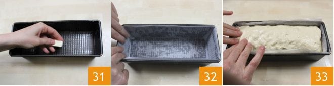 Fetten Sie nun eine Kastenkuchenform der Größe 25x12 cm ein 31 und legen Sie Backpapier hinein 32, und stellen Sie das Brot und Salami mit der Teignähte nach unten, sodass der Teig nach oben drückt 33.