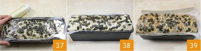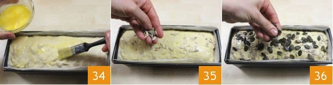 Bestreichen Sie die Oberfläche mit einem verquirlten Ei 34 und bestreuen Sie sie nach Belieben mit Sonnenblumen- 35 und Kürbiskernen 36, indem Sie sie gut andrücken, damit sie an der Oberfläche haften bleiben. Wenn Sie möchten, können Sie Ihr Brot und Salami auch mit Sesam- oder Mohnsamen würzen. Andernfalls lassen Sie es glatt und fügen Sie dem verquirlten Ei einige Tropfen Milch hinzu, um eine noch goldene Oberfläche zu erhalten.