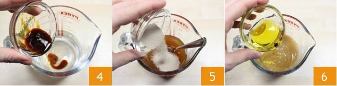 Lösen Sie den Malz im restlichen Wasser auf 4 (oder alternativ einen Teelöffel Zucker), den getrockneten Bierhefe 5 (alternativ können Sie 12,5 g frische Bierhefe verwenden) und schließlich das extra native Olivenöl 6, gut vermischen, um alle Zutaten zu mischen. Sie können den Brotteig auch mit Sauerteig zubereiten: Ersetzen Sie die Bierhefe durch etwa 200 g Sauerteig und verlängern Sie die Gärzeit um 3-4 Stunden.