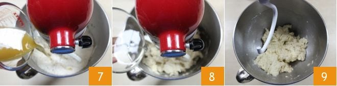 Montieren Sie den Flachrührer in der Küchenmaschine und, sobald sie eingeschaltet ist, fügen Sie zuerst das Wasser mit Malz, Hefe und Öl hinzu 7 und beginnen Sie dann mit mittlerer Geschwindigkeit zu kneten. Wenn Sie von Hand kneten, sammeln Sie die Zutaten kräftig ein. Nach 1 Minute fügen Sie auch das Wasser hinzu, in dem Sie das Salz aufgelöst haben 8, und kneten Sie weiter. Wenn sich die Mischung um den Flachrührer gesammelt hat, ersetzen Sie ihn durch den Knethaken 9 und kneten Sie weiter mit mittlerer bis niedriger Geschwindigkeit für mindestens 5 Minuten, bis der Teig glatt und homogen ist.