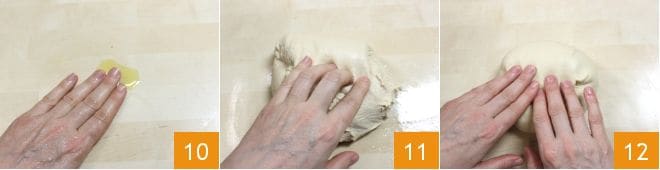 Nach dieser Zeit gießen Sie einen Faden Öl auf eine Arbeitsfläche 10, damit Sie kneten können, ohne Mehl hinzuzufügen, dann übertragen Sie den Teig darauf und beginnen, ihn mit den Händen zu bearbeiten, bis er eine runde Form annimmt (11-12).