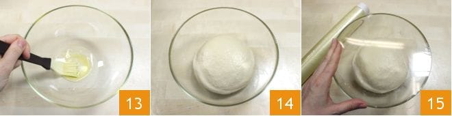 Ölen Sie eine Schüssel, indem Sie einen Pinsel verwenden 13, und geben Sie den Teig hinein 14, bedecken Sie ihn mit Folie 15 und lassen Sie ihn mindestens zwei Stunden bei einer Raumtemperatur zwischen 28 und 30°C gehen, bis er sein Volumen verdoppelt hat.