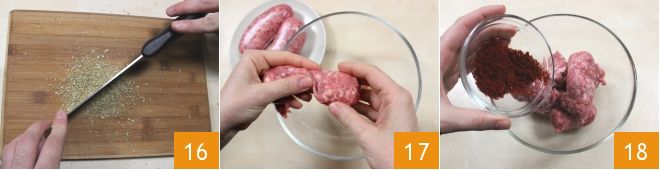 In der Zwischenzeit bereiten Sie die Füllung vor: Füllen Sie zunächst einen Topf mit einem Durchmesser von etwa 25 cm mit Wasser und bringen Sie es zum Kochen. Die Größe des Topfes ist wichtig, da er die Wurst im Ganzen fassen muss. Geben Sie dann die Fenchelsamen auf ein Schneidebrett und hacken Sie sie fein mit einem Messer oder auch mit einer Kaffeemühle 16. Schneiden Sie dann die Oberfläche der Salami ein, zerkrümeln Sie sie in eine Schüssel 17 und fügen Sie das süße Paprikapulver hinzu 18. Sie können Wurst anstelle von Salami verwenden, auch solche, die typisch für Ihre Region ist, oder Salami-Paste. Würzen Sie sie außerdem, wie Sie es bevorzugen: mit Gewürzen oder aromatischen Kräutern oder indem Sie den Paprika durch süße Paprika ersetzen.