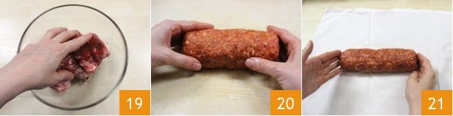Nachdem Sie auch die gehackten Fenchelsamen hinzugefügt haben, mischen Sie alles von Hand für 5 Minuten 19, dann ölen Sie erneut die Arbeitsfläche und übertragen Sie die Mischung darauf, bearbeiten Sie sie von Hand und formen Sie sie zu einer etwa 20 cm langen zylindrischen Form 20. Dann nehmen Sie ein Musselin oder ein sauberes Handtuch und legen die Wurst darauf 21.