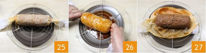 Einmal gekocht, lassen Sie die Wurst auf einem Gitter abtropfen 25, unter dem Sie einen Teller platziert haben, und drücken Sie sie, indem Sie die Ränder des Musselins drücken 26, sodass überschüssiges Wasser und Fett austreten. Dann öffnen Sie das Musselin oder das Handtuch, in das Sie die Mischung gewickelt haben, und lassen es bei Raumtemperatur abkühlen 27. Es ist wichtig, dass die Füllung nicht völlig abgekühlt, sondern auf Raumtemperatur gebracht wird, sonst riskiert der Teig, nicht richtig zu gehen.
