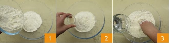 Um den Brotkranz zuzubereiten, gib die zwei Mehle in eine große Schüssel 1, füge die Trockenhefe hinzu 2 und beginne zu kneten, während du das Wasser langsam einfließen lässt 3.