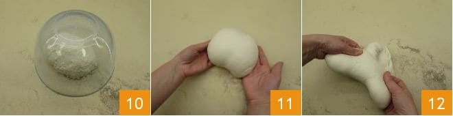 Lass ihn weitere 10 Minuten unter der Schüssel ruhen 10 und wiederhole diesen Vorgang noch 2 weitere Male (11-12). Du musst 4 Runden Faltenbildung machen, um das Klebergerüst zu stärken und dem Teig Spannung zu geben.
