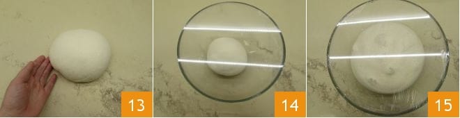 Nachdem die letzte Falte gemacht wurde, forme den Teig zu einer Kugel 13 und lege ihn in eine Schüssel. Bedecke mit Klarsichtfolie 14 und lasse ihn etwa 1 Stunde gehen. Lege ihn dann für 18 Stunden in den Kühlschrank. Nach dieser Zeit wird der Teig nicht aufgegangen sein, aber keine Sorge. Lass ihn bei Raumtemperatur aufgehen und weitere 2 Stunden gehen. Zu diesem Zeitpunkt wird er sein Volumen verdoppelt haben und Blasen 15 zeigen.