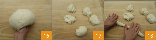 Übertrage den Teig dann auf eine Arbeitsfläche 16 und teile ihn in 5 gleiche Teile von jeweils 165 g 17. Nimm ein Stück und forme einen Strang von etwa 50 cm Länge 18.
