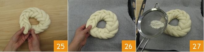 und verbinde sie mit dem Anfang, um einen Kranz 25 zu formen. Lege ihn auf ein mit Backpapier ausgelegtes Backblech und drücke gut an der Verbindung der beiden Teile 26. Bestäube die Oberfläche des Kranzes mit Mehl 27