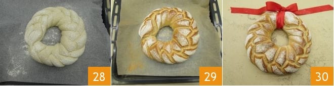 und lasse ihn noch eine Stunde gehen 28, immer bei Raumtemperatur. Die ideale Temperatur liegt bei 26-28 °C. Nach der Gehzeit stelle eine kleine Schüssel mit etwa 60 g Wasser auf den Boden des auf 220 °C vorgeheizten statischen Ofens. Backe auch den Brotkranz im mittleren Rost und backe ihn etwa 40 Minuten, bis er schön golden ist 29. Dann aus dem Ofen nehmen und vor dem Servieren abkühlen lassen 30.