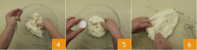 Knete weiter, bis du einen kompakten Teigball 4 erhältst, füge dann das Salz hinzu 5 und knete noch ein paar Minuten weiter. Übertrage ihn dann auf eine Arbeitsfläche und beginne, dem Teig Falten zu geben. Du musst einen der Ränder zu dir ziehen und ihn wieder zur Mitte führen 6.