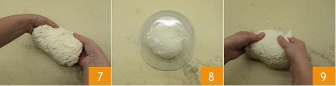 Wiederhole diesen Schritt einige Male, um den gesamten Teig aufzunehmen 7, dann bedecke ihn mit der Schüssel 8 und lasse ihn etwa zehn Minuten ruhen. Hole ihn wieder heraus und mache die zweite Runde der Faltenbildung, wie gerade gemacht 9.