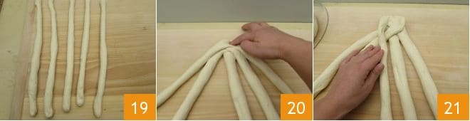 Wiederhole den gleichen Vorgang auch für die anderen vier Stücke 19. An diesem Punkt verbinde die Stränge nur an einem Ende und lege sie auf die Arbeitsfläche 20, beginne sie zu flechten, indem du den ersten Strang zu deiner Linken zur Mitte führst 21.