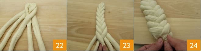 Nimm dann den ersten Strang zu deiner Rechten und führe ihn zur Mitte, indem du ihn über den vorherigen legst 22. Fahre auf diese Weise fort, indem du immer mit dem äußersten beginnst, einmal links und einmal rechts, bis die Stränge vollständig geflochten sind 23. Am Ende verschließe die Naht gut 24