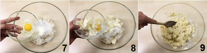 Nach den zehn Minuten drücken Sie die Brotkrume gut aus und fügen Zucker und Ei hinzu 8, dann die weiche Butter in Stückchen geschnitten 8. Rühren Sie gut mit einem Holzlöffel, um alle Zutaten zu vermischen 9.