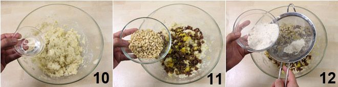 Fügen Sie den Grappa hinzu 10, dann die abgetropften Rosinen, die Zitronenschale, die Pinienkerne 11 und schließlich das gesiebte Mehl 12.