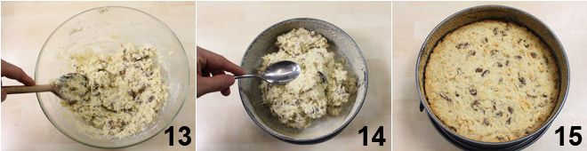 Vermischen Sie die Zutaten sehr gut, bis Sie eine kompakte und homogene Masse erhalten 13, die Sie in die gebutterte Backform geben 14. Drücken Sie sie mit dem Rücken eines Löffels gleichmäßig aus und glätten Sie die Oberfläche 14, backen Sie den Kuchen bei 180 °C für etwa 60 Minuten: die Oberfläche sollte goldbraun sein 15. Nehmen Sie den Kuchen aus dem Ofen und lassen Sie ihn abkühlen: Ihr Brotkuchen ist fertig!