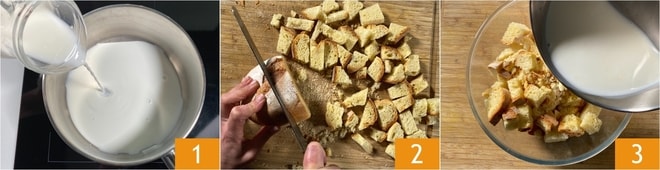 Um die Brotpfannkuchen zuzubereiten, erhitzen Sie zuerst die Milch in einem kleinen Topf 1, dann schneiden Sie das trockene Brot in Würfel 2. Geben Sie das Brot in eine Schüssel und übergießen Sie es mit der heißen Milch 3.