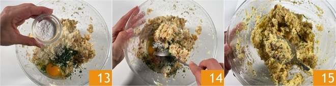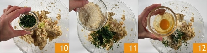 Geben Sie auch die Petersilie 10, den geriebenen Parmigiano Reggiano DOP 11 und das Ei hinzu 12.