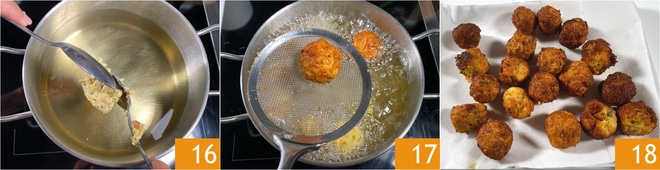 Formen Sie mit den Händen Kugeln oder tauchen Sie die Masse mit Hilfe eines weiteren Löffels in das Öl 16. Frittieren Sie ein paar Stücke auf einmal bis sie goldbraun sind, um zu vermeiden, dass die Öltemperatur sinkt 17. Lassen Sie sie auf Küchenpapier abtropfen und genießen Sie die Brotpfannkuchen noch heiß 18!