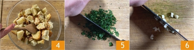 Rühren Sie mit einem Löffel um 4 und lassen Sie es ein paar Minuten zugedeckt mit Frischhaltefolie ruhen. Hacken Sie in der Zwischenzeit die Petersilie fein 5 und den Knoblauch ohne Keimling 6.