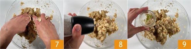 Zerreiben Sie das eingeweichte Brot mit den Händen 7, fügen Sie dann Salz, Pfeffer 8 und den gehackten Knoblauch hinzu 9.