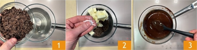 Um die Paradies Brownies zuzubereiten, beginnen Sie damit, die gehackte Schokolade in eine Schüssel für das Wasserbad zu geben 1. Fügen Sie die in Stücke geschnittene Butter und eine Prise Salz hinzu 2. Rühren Sie gelegentlich um, bis alles geschmolzen ist 3, und lassen Sie es dann abkühlen.
