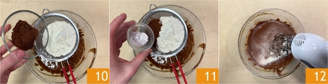 Fahren Sie mit dem Kakao 10 und dem Backpulver 11 fort und mischen Sie erneut mit dem elektrischen Handmixer 12.