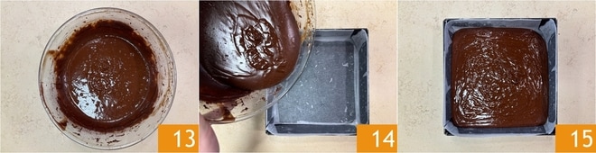 Wenn auch die Pulver gut eingearbeitet sind 13, fetten und legen Sie eine 25x25 cm große Backform mit Backpapier aus, geben Sie den Teig hinein 14 und verteilen Sie ihn gleichmäßig mit einem Spatel 15. Backen Sie im vorgeheizten statischen Ofen bei 180° für etwa 30-35 Minuten auf der mittleren Schiene.