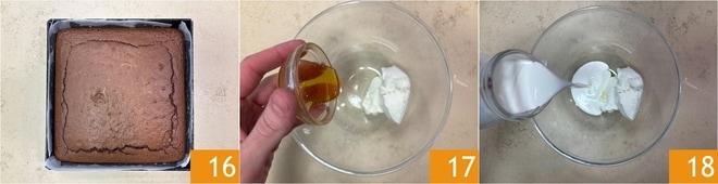 Nehmen Sie den Brownie aus dem Ofen und lassen Sie ihn abkühlen 16. In der Zwischenzeit bereiten Sie die Creme vor: Geben Sie in eine Schüssel den Mascarpone, den Honig 17 und die Sahne 18.