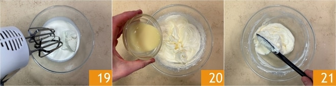 Beginnen Sie mit dem elektrischen Handmixer zu schlagen 19, dann geben Sie auch die Kondensmilch hinzu 20. Rühren Sie vorsichtig mit einem Spatel, um sie zu vermischen, und stellen Sie sie beiseite 21.