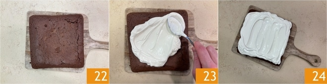 Sobald der Kuchen abgekühlt ist, stürzen Sie ihn auf ein Schneidebrett 22, dann bestreichen Sie die Oberfläche mit der Creme und kreieren mit der Rückseite eines Löffels einen gespannten Effekt 23. Stellen Sie ihn für mindestens 2 Stunden in den Kühlschrank 24. Danach können Sie den Kuchen in Würfel schneiden. Sie können die Paradies Brownies in 9 großzügige Würfel oder in 16 kleinere Portionen teilen, die Wahl liegt bei Ihnen!