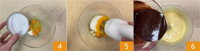 Schlagen Sie die Eier in eine Schüssel mit dem Zucker 4, und rühren Sie mit dem elektrischen Handmixer 5, bis Sie eine helle und schaumige Masse erhalten. Fügen Sie nun die abgekühlte dunkle Schokolade hinzu 6.