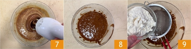 Schlagen Sie weiter mit dem elektrischen Handmixer 7, um eine gleichmäßige Masse zu erhalten 8. Sieben Sie das Mehl hinein 9.