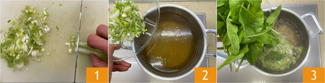 Um die Bruschetta mit dicken Bohnen und Kräutern zuzubereiten, bereiten Sie zunächst die Gemüsebrühe nach unserem Rezept zu und halten Sie sie warm. Schneiden Sie die Frühlingszwiebel zunächst längs in zwei Hälften und dann in Ringe 1. Geben Sie die Frühlingszwiebel in die kochende Brühe 2 und kochen Sie sie 3 Minuten lang, dann geben Sie auch die zuvor gereinigten Kräuter hinzu 3 und lassen Sie alles abtropfen. Beiseite legen.