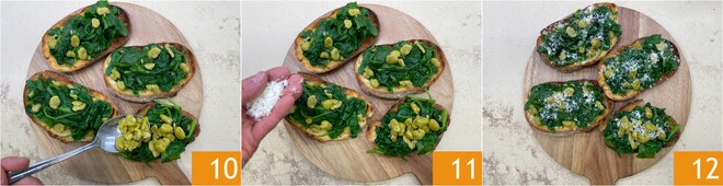 Belegen Sie die Bruschetta, indem Sie die Kräuter auf dem Brot verteilen, dann die dicken Bohnen hinzufügen 10 und jede mit einem Teelöffel Öl und einem Teelöffel Parmesan würzen 11. Ihre Bruschetta mit dicken Bohnen und Kräutern ist bereit, genossen zu werden 12!