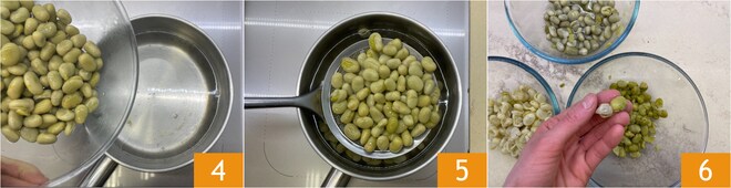 Blanchieren Sie die dicken Bohnen in leicht gesalzenem, kochendem Wasser für eine Minute 4. Abtropfen lassen 5 und abkühlen lassen, dann schälen 6.