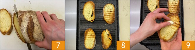 Schneiden Sie das Brot in Scheiben 7 und grillen Sie es auf einer heißen Platte 8. Sobald es geröstet ist, reiben Sie das Brot mit Knoblauch ein 9.