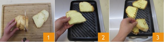 Um die Bruschetta mit Feigen und mildem Rohschinken zuzubereiten, schneiden Sie den Brotlaib in vier gleich dicke Scheiben 1. Erhitzen Sie eine Grillpfanne oder den Grill und rösten Sie das Brot einige Minuten pro Seite (2-3). Stellen Sie die Bruschetta beiseite.