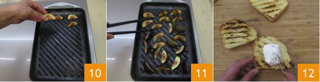 Legen Sie sie auf den heißen Grill 10: grillen Sie sie einige Sekunden pro Seite und wenden Sie sie dabei mit einer Küchenzange 11. Nun ist alles bereit, um die Bruschetta zu belegen. Nehmen Sie eine Brotscheibe und bestreichen Sie sie mit der Robiola‑Schnittlauch‑Creme 12.