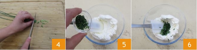 Jetzt kümmern Sie sich um die Käsecreme. Waschen Sie den Schnittlauch und hacken Sie ihn fein 4. Geben Sie ihn in eine Schüssel zur Robiola 5 und verrühren Sie die Zutaten gut 6.