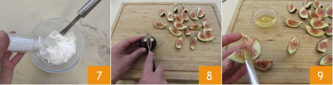 Mit Salz und Pfeffer abschmecken 7 und beiseite stellen. Fahren Sie mit der Zubereitung der Feigen fort: Waschen Sie sie, schneiden Sie sie halb und jede Hälfte in drei Teile 8. Bestreichen Sie sie rundherum mit etwas Honig 9.