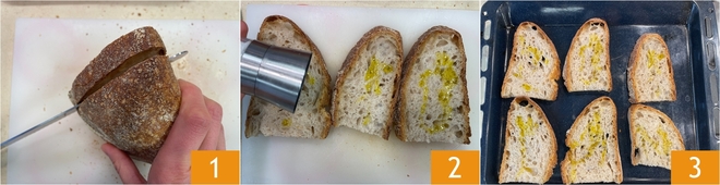 Für die Bruschetta mit Käse und Kirschtomaten zunächst das Brot in Scheiben schneiden 1. Mit 2 Esslöffeln Olivenöl beträufeln, einer Prise Salz 2 und etwas Pfeffer würzen und dann auf ein Backblech legen 3. Im Grillmodus bei 220 °C für 6–7 Minuten backen, bis sie goldbraun und knusprig sind.