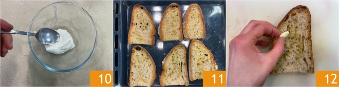 Inzwischen die Crescenza mit einem Löffel cremig rühren, damit sie weicher wird. Sobald die Bruschette fertig sind, aus dem Ofen nehmen 11 und sofort mit einer Knoblauchzehe einreiben, um ihnen zusätzliches Aroma zu verleihen 12.