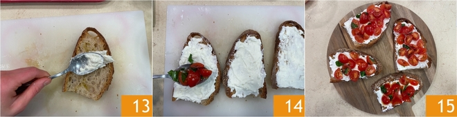 Die Crescenza dann auf dem noch warmen Brot gleichmäßig verstreichen 13. Mit den marinierten Tomaten belegen und diese auf die einzelnen Scheiben verteilen 14. Mit dem restlichen Öl beträufeln und die Bruschetta mit Käse und Kirschtomaten sofort heiß servieren 15.